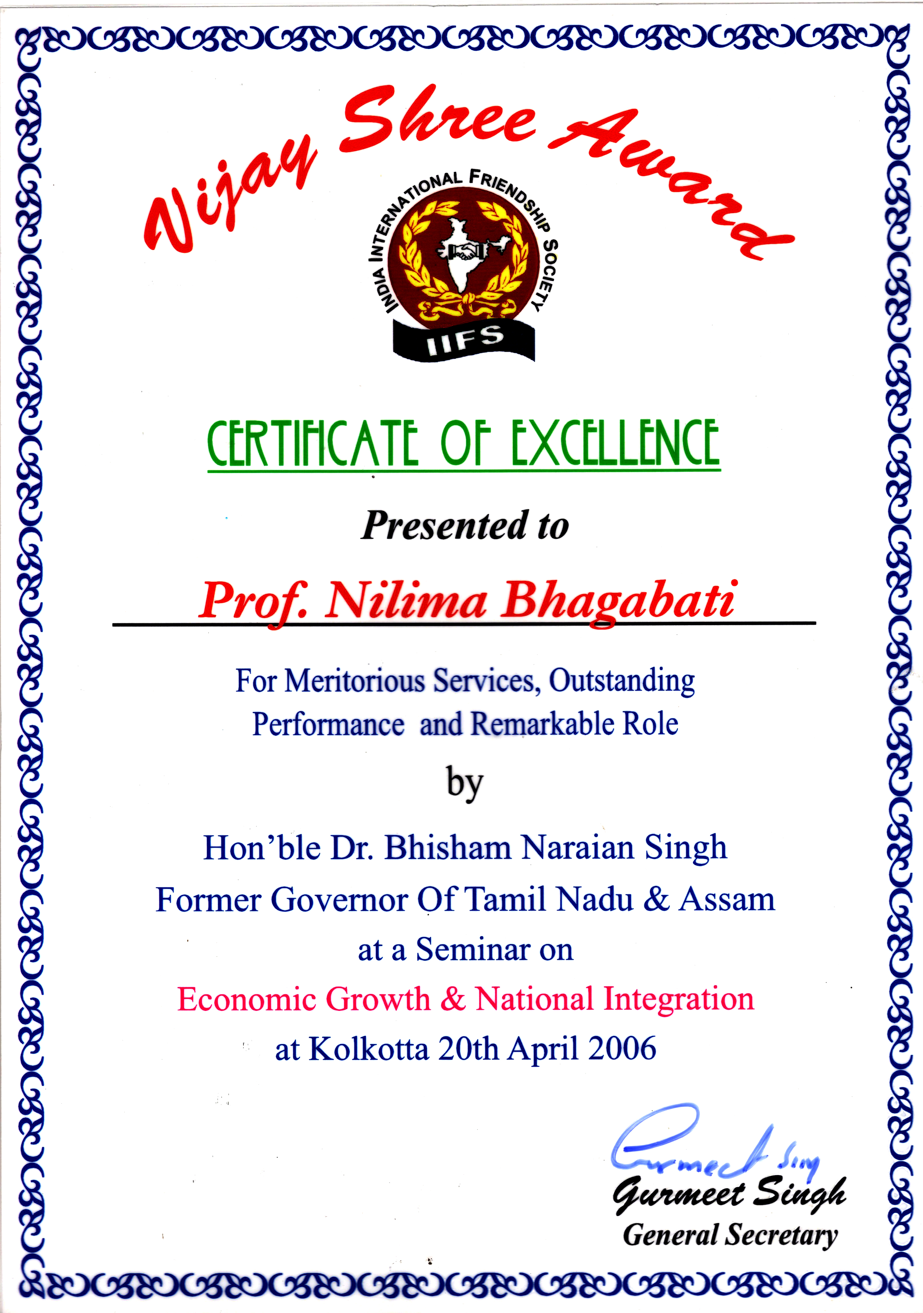Honored with the Award of Excellence in Education by the International Indian Friendship Society in 2006.